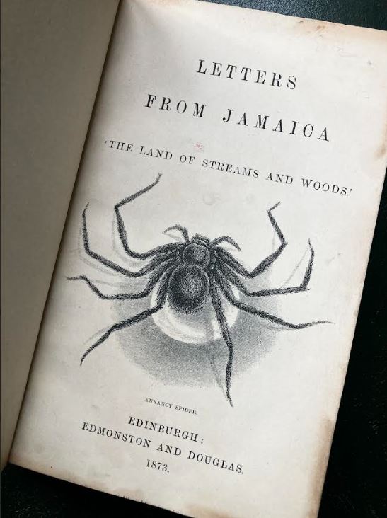 Letters From Jamaica (Edinburgh, 1873) is a small book that “pretend(s) to being nothing more but a truthful record of a traveller’s impression of Jamaica and its people”, its author writes. It consists in a series of short picturesque articles, written by Charles Joseph Galliari Rampini (1840-1907), a Scottish lawyer who knew Jamaica well. His obituary (findagrave.com) states: “A year later (1866), he was appointed a Stipendiary Magistrate Jamaica; in 1867 became District Court Judge at Port Antonio; in 1868 at Maudville(sic), and in 1876 at, Kingston.” Beyond the contempt that is to expected from such a traveller, Rampini was clearly interested in many aspects of the Negro culture—including obeah (or voodoo, “far from uninteresting subject,” he says), and what we now call “patois”. This language is a sort of “broken English” invented by the slaves. The Jamaican intellectuals love to emphasize its African heritage, but “patois” is mostly based on phonetic distortions, grammatical simplifications and lyrical emphasis. Let’s remember that it was a survival tool. Its creativity has always fascinated the outsiders such as Matthew “The Monk” Lewis, who went twice to Jamaica in the early 19th century, or such as our friend Rampini. Both were particularly interested in an old spider that goes by the name of Anancy.