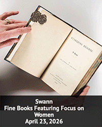April 23, 2026Swann, Apr. 23: Thomas Heywood. An Apology for Actors. London: Printed by Nicholas Okes, 1612. $3,000 to $5,000.Swann, Apr. 23: Illuminated Islamic Devotional Manuscript. 19th century. Approx. 90 leaves with gilt-decorated title and 2 full page miniatures of Mecca and Medina. $800 to $1,200.Swann, Apr. 23: Antiphonal in Latin. Manuscript on Parchment. Cologne, early 16th century. $7,000 to $9,000.Swann