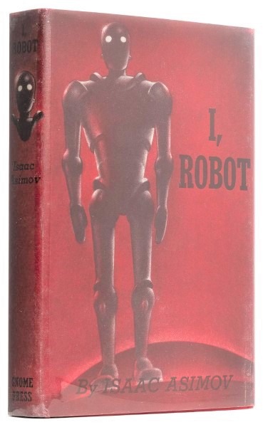 ASIMOV, Isaac (1920-1992). I, Robot. New York: Gnome Press, Inc., [1950]. 8vo. 253, [3, blank] pp. Publisher's full red cloth, front board and spine, publisher's unclipped ("$2.50") dust jacket (cloth binding bumped at spine and corners of front board, bookseller's ticket on fp.; jacket spine a bit dull and rubbed, some rubbing to front jacket panel at fore-edge, minor additional rubbing). Fine, better than usually seen. FIRST EDITION OF THIS LANDMARK SHORT STORY COLLECTION. This collection has the story in which Asimov's "Three Laws of Robotics" first appeared (Runaround). This book inspired the 2004 film starring Will Smith. From the renowned personal collection of Dr. George D. Lacy. Measurements: 9 x 6 x 2”. https://rarebookhub.com/auction_lot_books/9359439?key=aaa066084662c11fc8167c78ece237596f1c862f