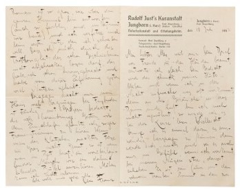 [Jungborn], 10 juillet 1912. 4 pages grand in-8 (226 x 145 mm), sur un bifeuillet, en-tête Rudolf Just's Kuranstalt Jungborn (I. Harz). Signée Franz". Enveloppe au même en-tête, à l'adresse de Brod, à Prague.