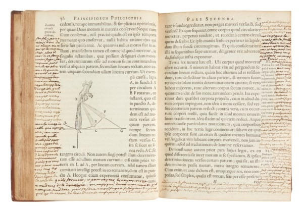 Cette œuvre a été, ici, considérablement annotée, sur plus de soixante-dix pages, par un lecteur francophone du XVIIe siècle. Fait intéressant, nombre de ces annotations font références à d'autres travaux, parmi lesquels ceux de Mallebranche, Bernouilli, Newton, Leibniz ou encore Huygens.
