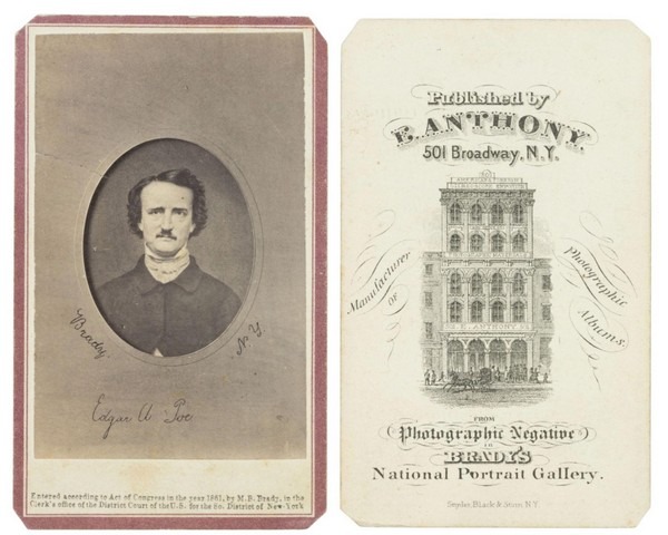 Exceptionally rare, possibly unique, carte-de-visite (CDV) portrait of Edgar Allan Poe, from the work of Mathew B. Brady, the most prominent American photographer of the 19th century. Below the image, within the photographic plate, are the printed inscriptions: "Brady," "N.Y.," and "Edgar A. Poe," in delicate script. Along the lower edge of the mount is the imprint: "Entered according to Act of Congress in the year 1861, by M.B. Brady, in the Clerk's office of the District Court of the U.S. for the So. District of New-York." The reverse of the mount is printed with ornate typography and an engraved illustration of the multi-story E. Anthony studio located at 501 Broadway, New York, and includes the publishing line: "From Photographic Negative in Brady's National Portrait Gallery."