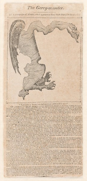 "The Gerry-Mander: A New Species of Monster, which Appeared in Essex South District in January Last" features a map of Newburyport's new congressional district in the form of a monstrous salamander. It was named in honor of Massachusetts governor Elbridge Gerry, who was held responsible for the special redistricting to benefit the Democratic-Republican Party.