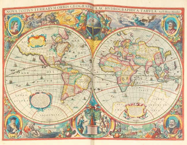 Atlas, ou Representation Du Monde Universel...Edition Nouvelle, 2 vol., engraved titles, engraved sectional titles, double-page engraved portrait of Mercator and Hondius, 238 (of 239, lacking "The Fenns") double-page engraved maps, later hand-colour heightened in gold, small area of loss (circa 10mm. diameter) on map of Macedonia in vol. 2 (p. 609), some toning, foxing and occasional browning, eighteenth century mottled calf, gilt spine, black morocco gilt title label on spine, early rebacking, worn [Koeman II, Me 36C], folio (485 x 320mm.), Amsterdam, Henricus Hondius, 1633
